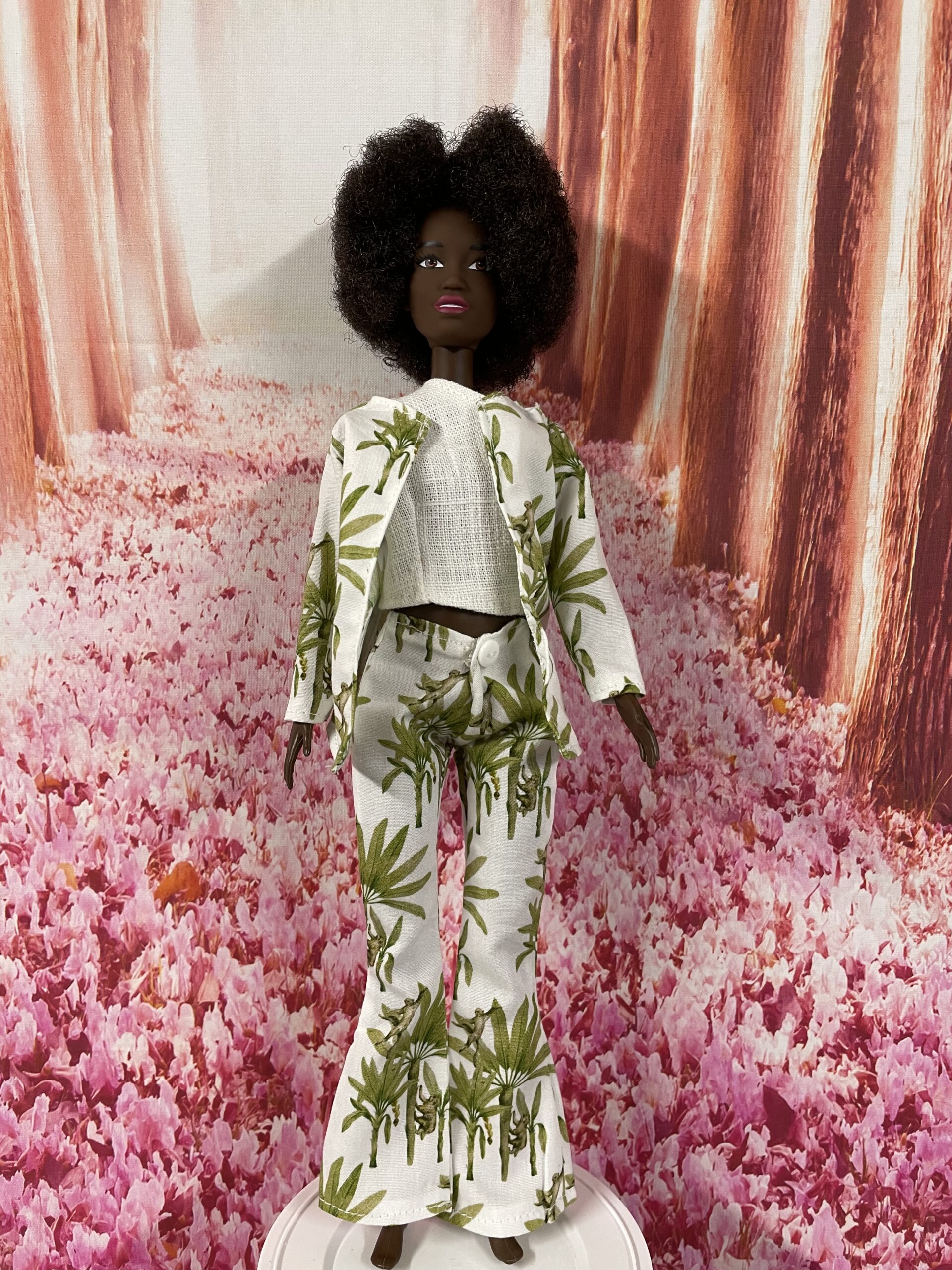 Broekpak Palina heeft een apen print met palmbomen over de broek en jas. Het pak bestaat uit een broek, jasje en een top.