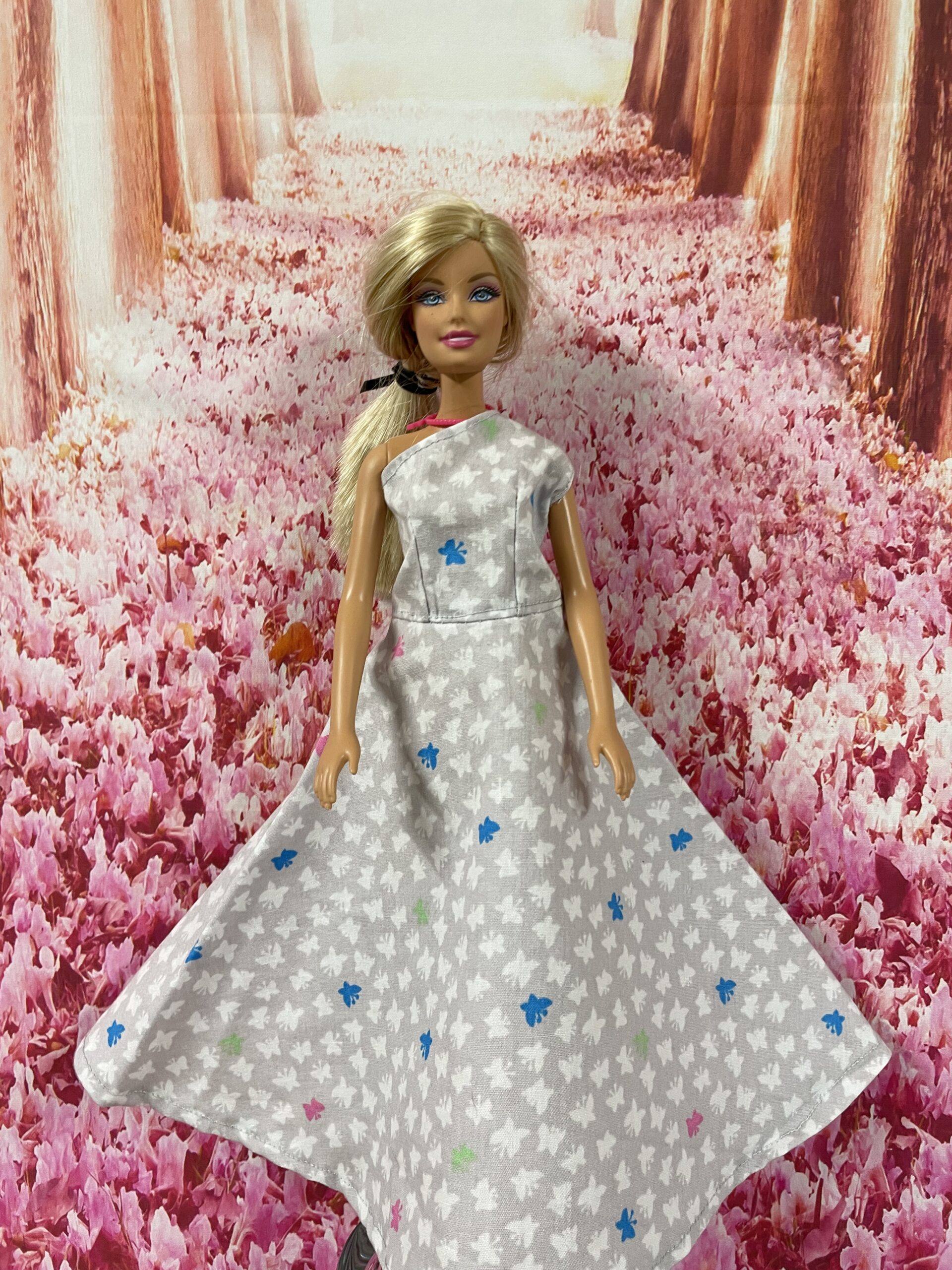 Zomer jurk Butterfly heeft over de hele jurk kleine subtiele vlindertjes in wit maar ook enkele andere vrolijke kleuren. Deze jurk heeft een linker schouder band en sluit met klittenband aan de achterkant.