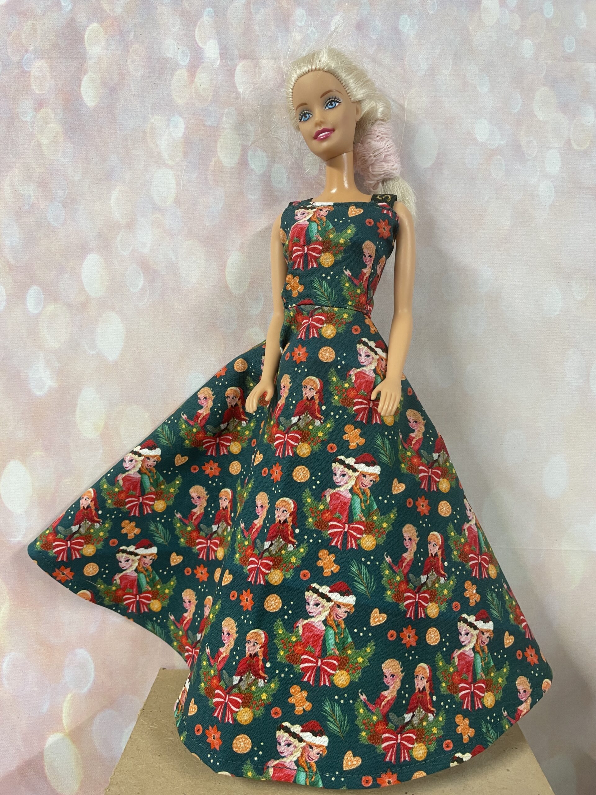 Kerst Jurk Kogry is van een donker groene stof met over het geheel een print van Elsa en Anna uit de Disney film Frozen.  Ze zijn in kerstkleding gekleed en zijn omringd door diverse kerst items. Deze jurk sluit aan de achterkant met klittenband en heeft twee groene schouderbandjes met gouden tekst “best friends” en roze hartjes.