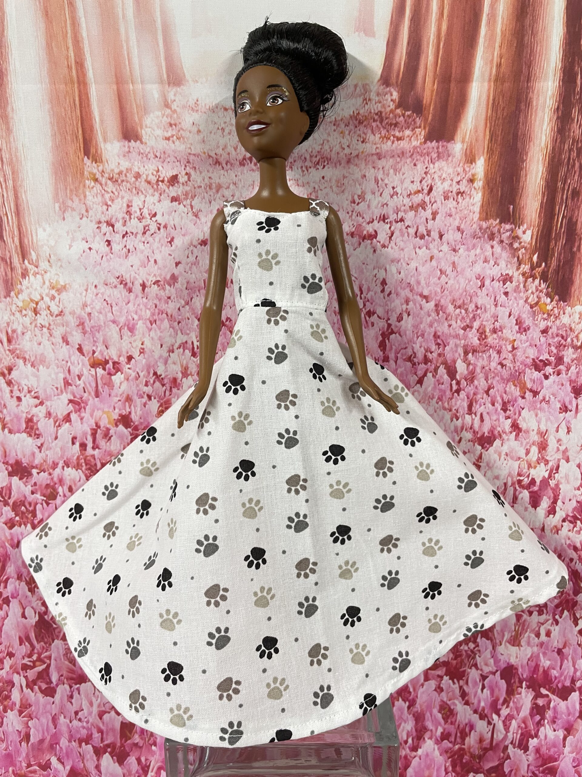 Zomer jurk Pebbles heeft een all over print van zwarte en drie kleuren bruine hondenpoot afdrukjes. Deze jurk heeft twee bruine schouderbandjes met motief. Aan de achterkant sluit deze jurk met klittenband.