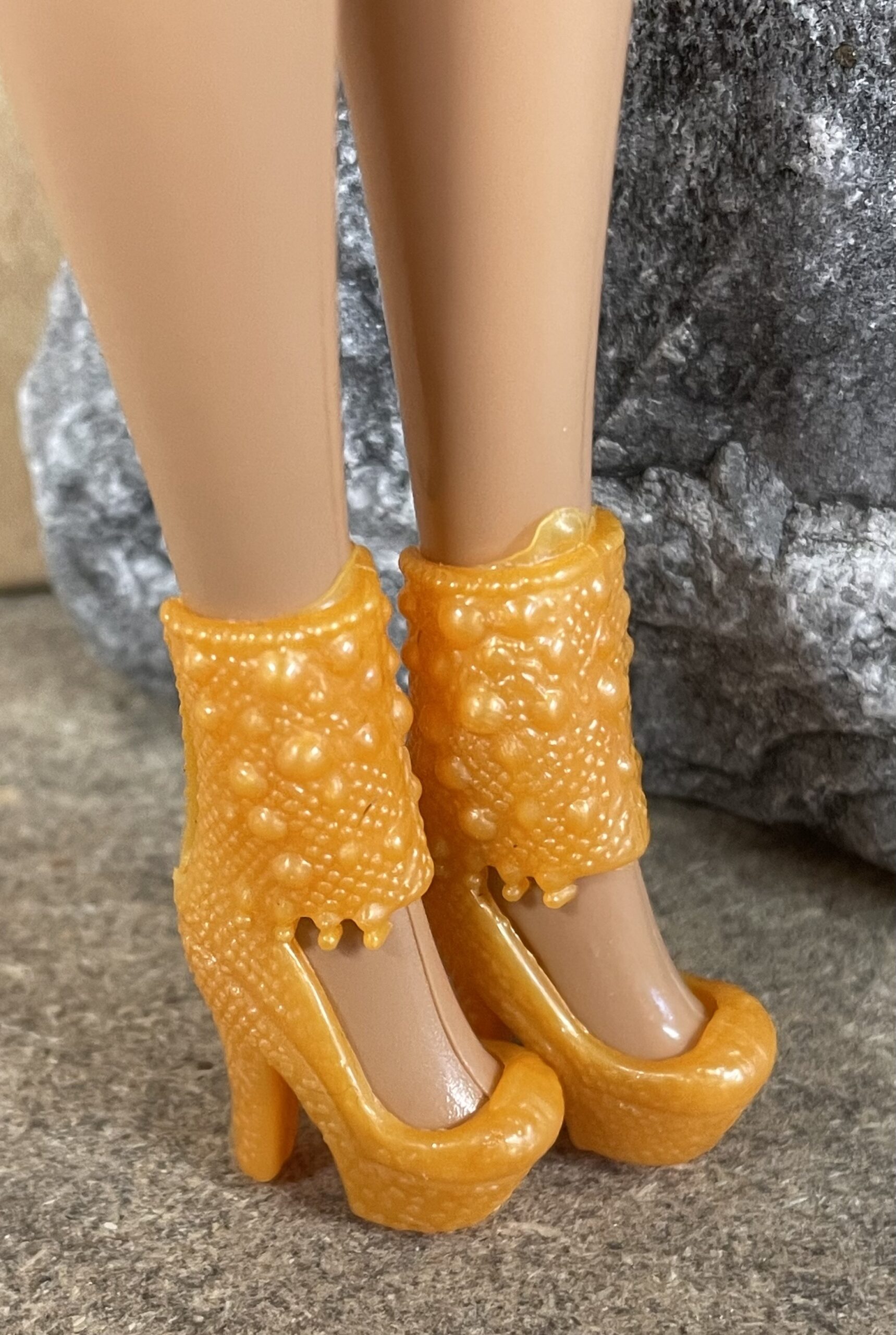Schoentjes Oudrie zijn oranje van kleur met een lichte metallic look. Het plastic schoentje heeft een hoge enkelband met bolletjes.