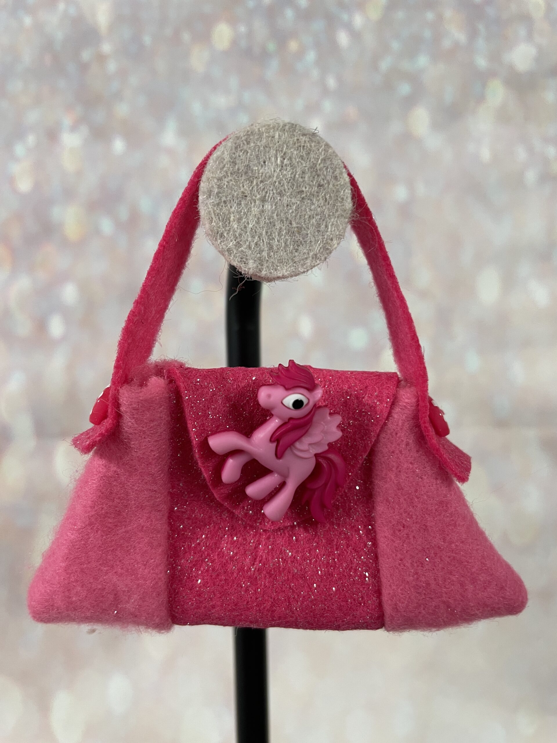 Tasje vilt fuchsia glitter met paardje. Het vilt van het middendeel en de schouderband zitten vol met glitters. De zijvakken zijn zonder glitter. de schouderband is bevestigd met fuchsia knoopjes met witte stippen. Het schattige paardje op de klep heeft twee kleuren en de klep kan open.