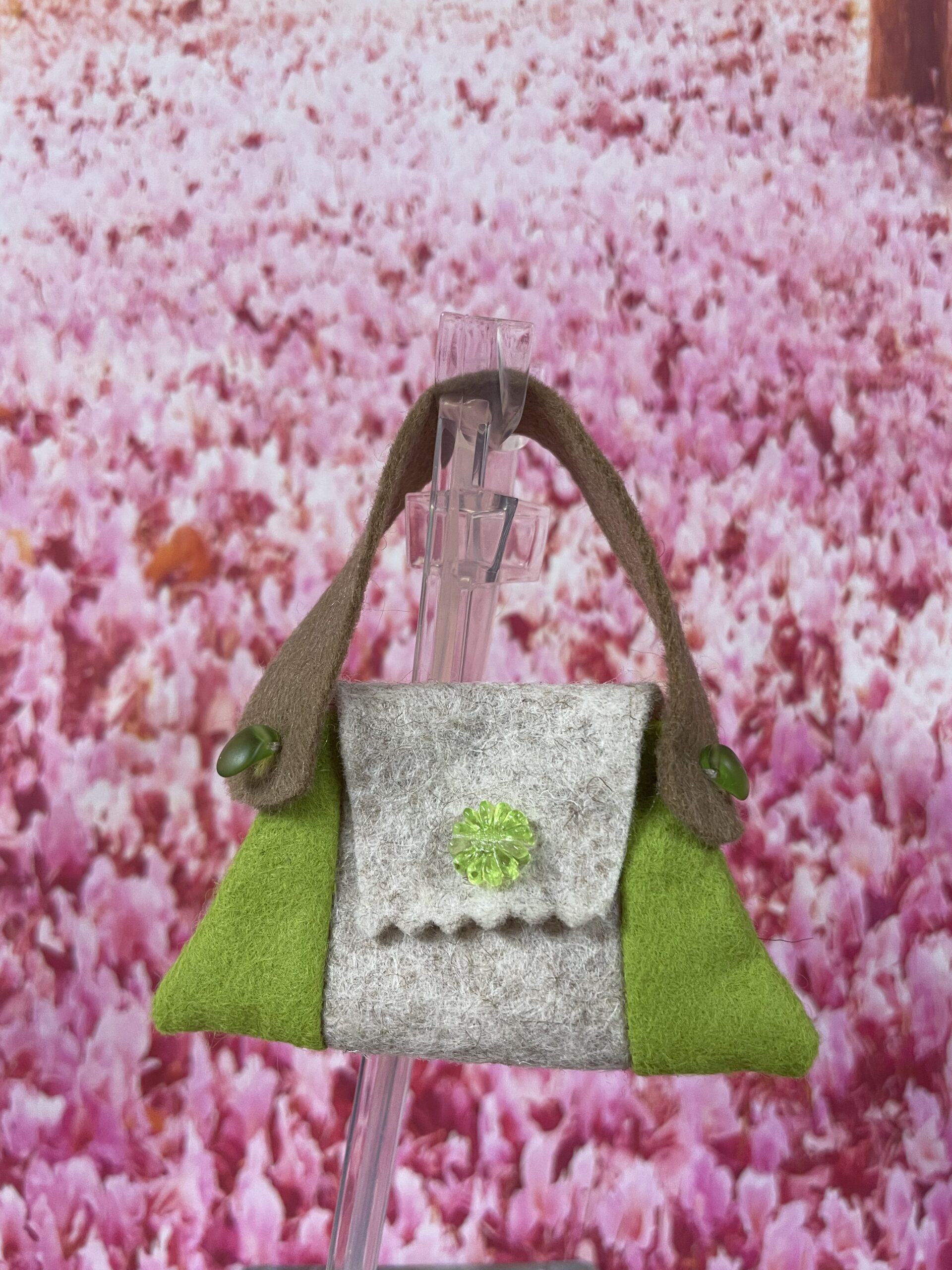Het is van vilt gemaakt. De schouderband is aan beide kanten bevestigd met groene glazen druppelkraal.