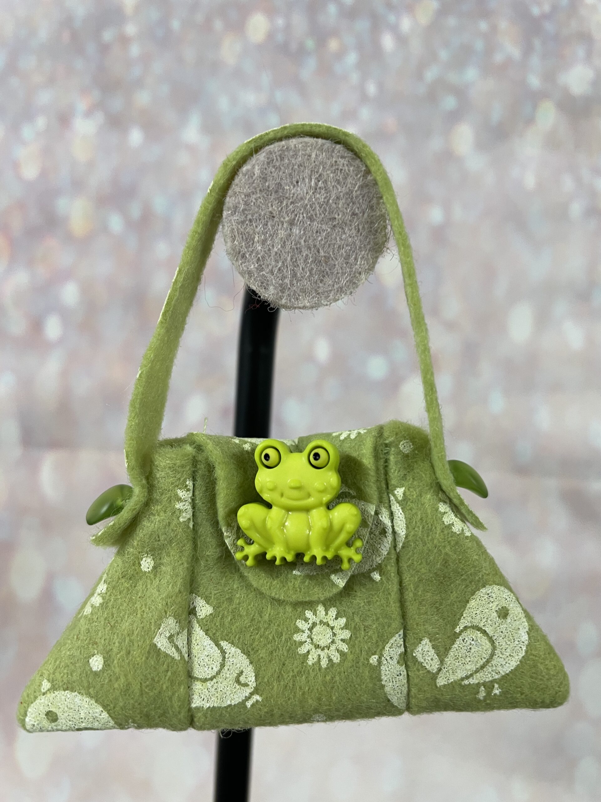 Tasje vilt groen met kikker. Het groene vilt heeft een witte vogel print. De schouderband is bevestigd met groene glazen druppel kralen. De klep kan open en op de klep zit de groene kikker.