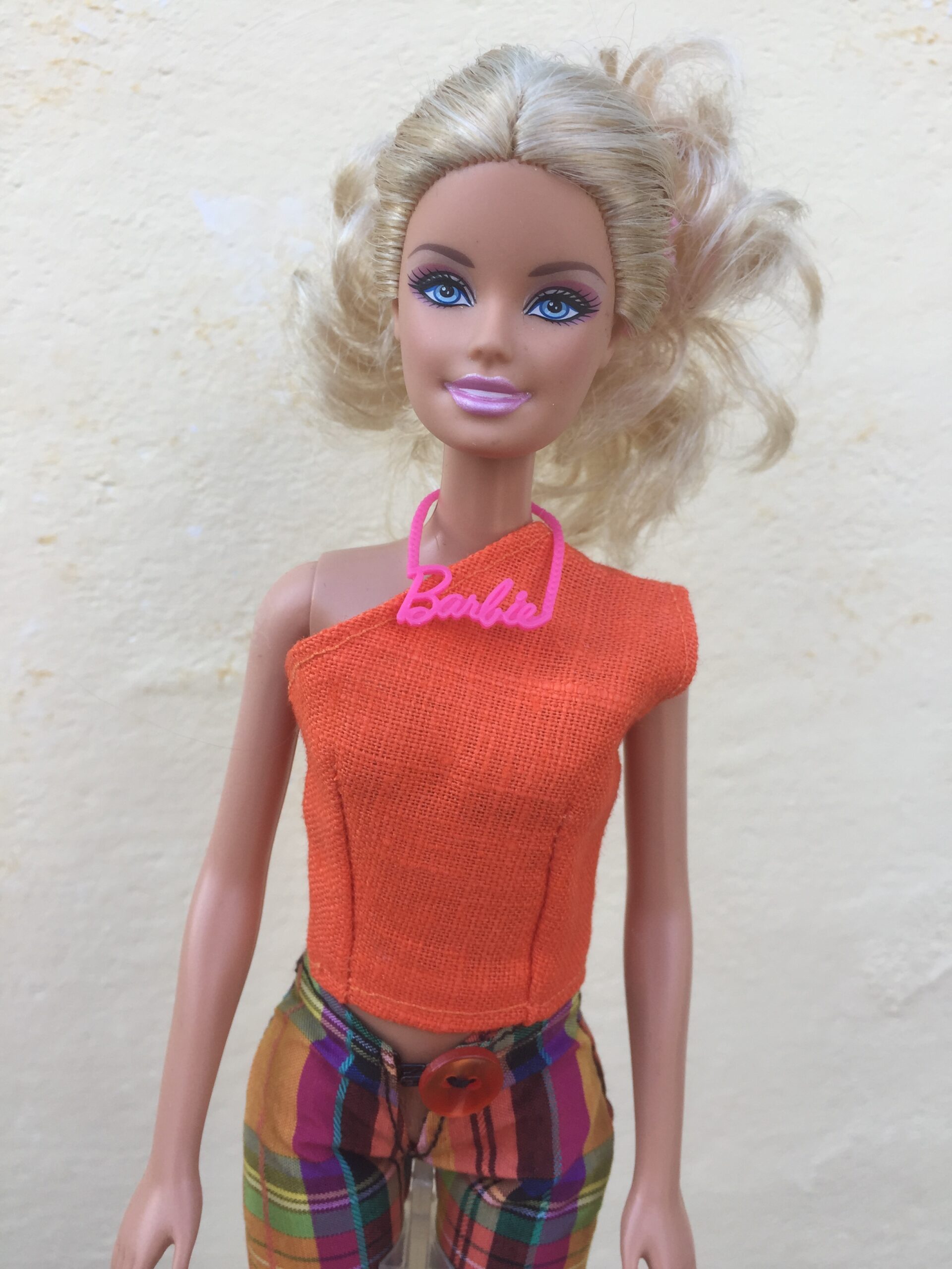 Top oranje van linnen/katoen. Heeft de schouderband aan de linkerkant. Sluit aan de achterkant met klittenband.